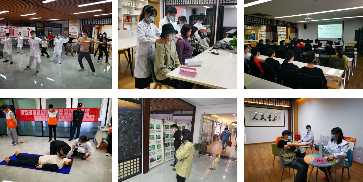 第一临床医学院学生党员、团员充分发挥各自专业优势,携带血压计、心肺复苏模拟人等器材,在社区工作人员的协助下,将活动场地区隔成不同区域。在健康咨询区,志愿者们根据内科、外科、妇科等不同专业方向,对社区居民的情况提出合理建议,提醒居民养成健康的生活习惯,并普及进入冬季后的日常保养知识。在按摩推拿区,志愿者们为社区周边长时间对着电脑的“上班族”进行了“一对一”的服务,在按摩的同时,教大家针对平时疲劳状况和常见的头痛、颈椎痛的基本按摩穴位和手法。在传统功法练习,志愿者现场指导教学八段锦,一招一式之间鼓励和引导社区群众积极参加体育健身活动,养成良好的体育锻炼习惯。此外,考虑到景星街社区地处闹市、人流量大,志愿者还向社区辖区内商铺服务人员、安保人员提供了徒手心肺复苏等急救知识培训,提高辖区群众应对紧急情况的能力。活动的最后,社区居民们聚集在社区活动室,一起聆听志愿者以“糖尿病怎么吃”“慢阻肺的防治”为主题的常见病知识宣讲。