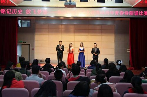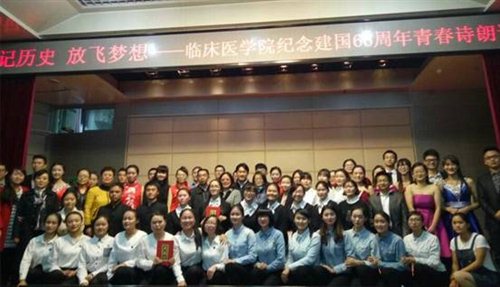 【学生党总支:李欣窈、周晓娜】为纪念建国66周年,缅怀革命烈士,传承和弘扬伟大的民族精神,进一步激发学生的爱国热情,由临床医学院学生党总支、学生团总支举办的“铭记历史,放飞梦想”纪念建国66周年青春诗朗诵比赛于2015年11月19日晚7点,在云南中医学院第一附属医院5楼会议室举行。此次活动得到了学校领导和医院党委的大力支持,医院党委书记陈燕溪、学校组织部部长黄卫东、宣传部副部长罗兵、医院副院长赵荣、学生党总支书记王云、党政办主任李亚萍及机关党总支书记高丹来到活动现场并担任了评委。280多名学生党员、团员观看了比赛。