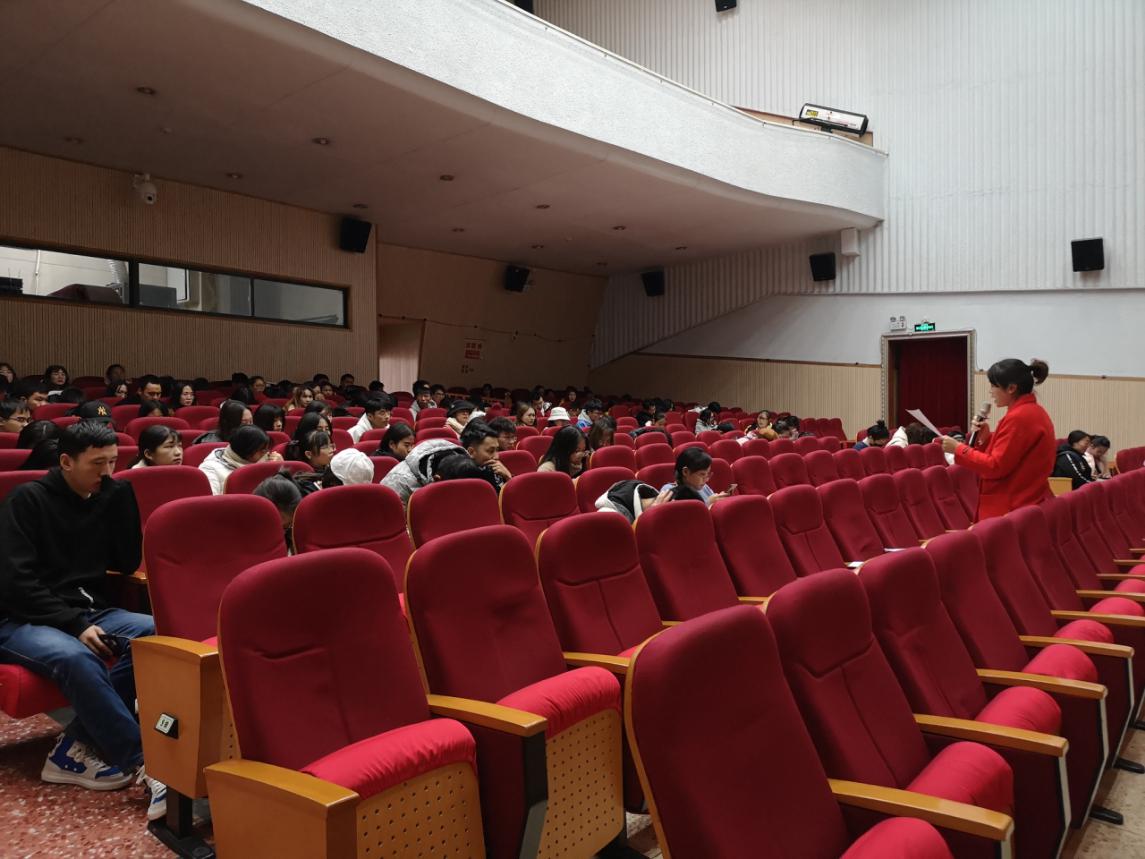 活动分两个阶段进行,第一阶段观看爱国影片《为国而歌》,第二阶段开展学习“十九届四中全会”精神主题团课。第一阶段,李欣窈老师在动员讲话:“作为祖国最有活力、最有激情、最有力量的广大青年,希望通过观看爱国影片,“不忘初心,牢记使命,永感党恩”;牢记在国难当头时刻,一群群热血青年为了救国,为了振兴民族而艰苦斗争的历程;希望广大青年学生在新时代用新思维、新方法去创造新的美好生活。”