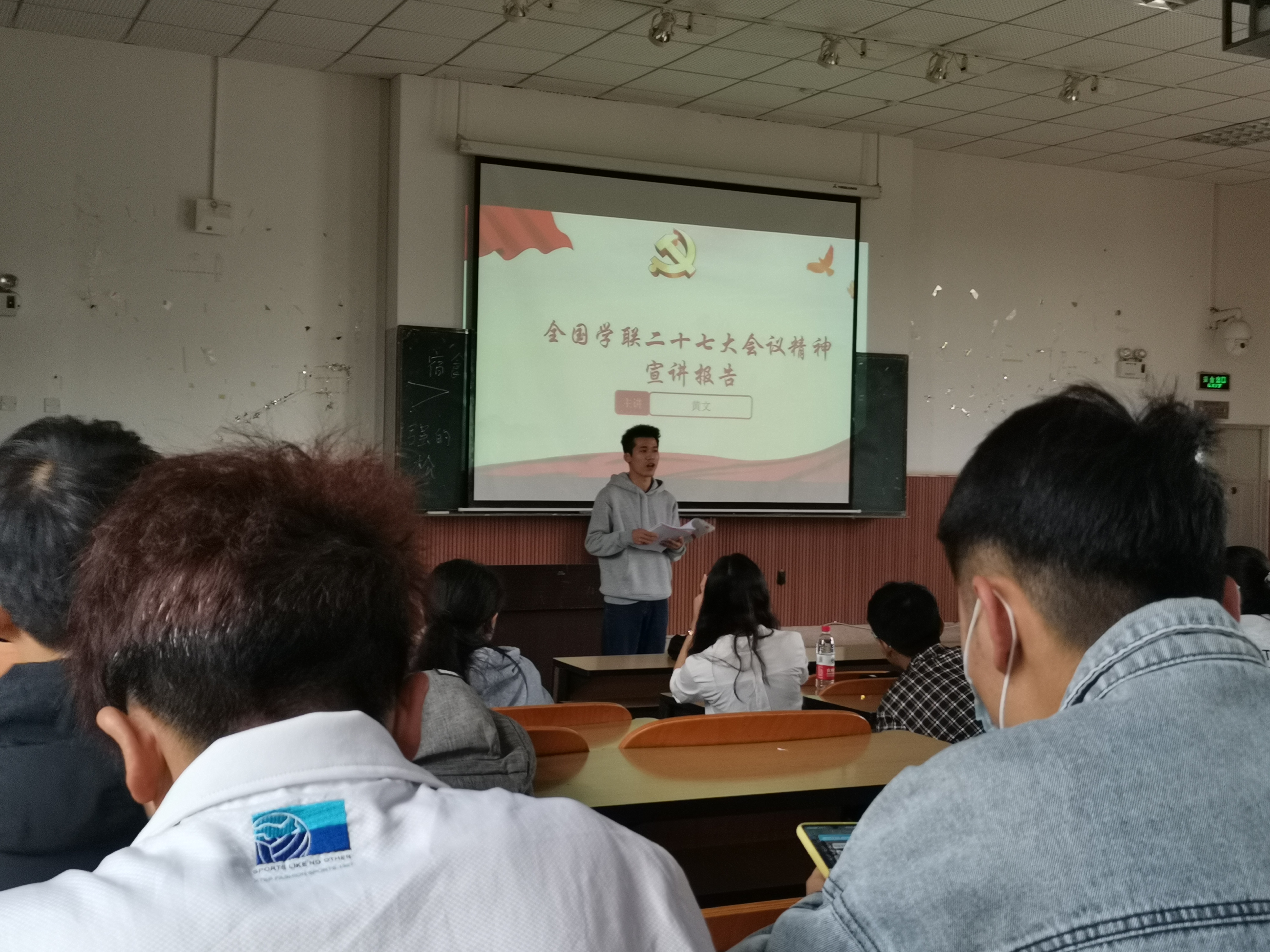 黄文同学从大会概况、大会议程、大会核心精神、大会重要意义、个人参会经历等方面做了精神传达和宣讲,重点传达了总书记的贺信精神以及全国学联工作报告的主要内容。并号召全体青年要牢记总书记的谆谆教导,听党话、跟党走,学生干部要服务好同学,以更高、更严的标准要求自己,与祖国共成长,与人民同奋进。
