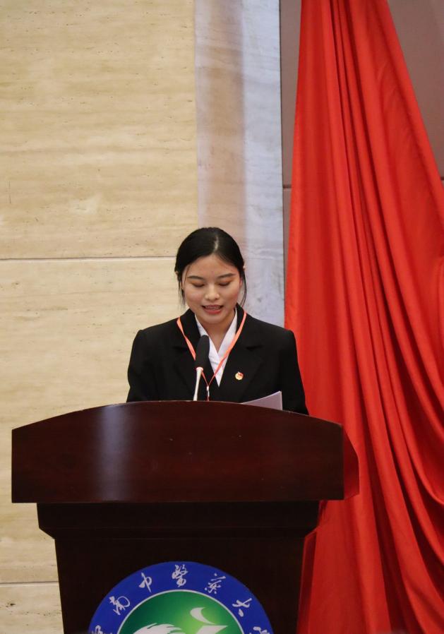 校学生会执行主席曹淇代表校学生会发言,向大会的召开表示了热烈的祝贺,并提出4点建议与大家共勉:一是必须始终把稳,理想信念之舵不动摇,坚定听党话、跟党走;二是必须始终严守,改革纪律之戒不含糊,永葆政治性、先进性、群众性;三是必须始终保持,服务同学之本不偏离,践行从同学中来,到同学中去;四是必须始终夯实,组织建设之基,坚实推进全面从严治会。