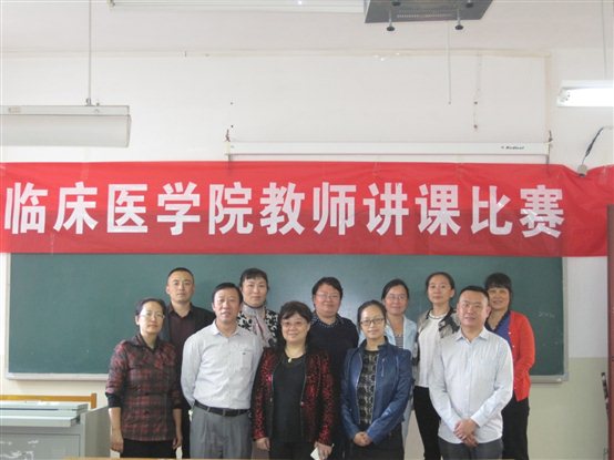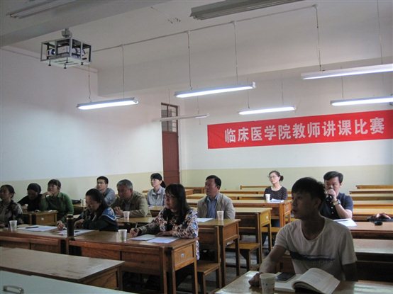 临床医学院/云南中医学院第一附属医院为了选拔青年教师参加学校第六届(2015 年)青年教师授课竞赛,进一步提高我院青年教师教学技能和水平,于2015年10月26日、27日下午,在白塔校区402教室举办了青年教师讲课比赛,邀请了教务处处长陈林兴教授,教师发展中心主任郭兆刚教授,临床医学院副院长赵荣教授,云南省省级教学名师、临床医学院教学督导苗晓玲及杨恩品教授,临床医学院教学督导委员会主任李琦教授担任此次比赛评委。