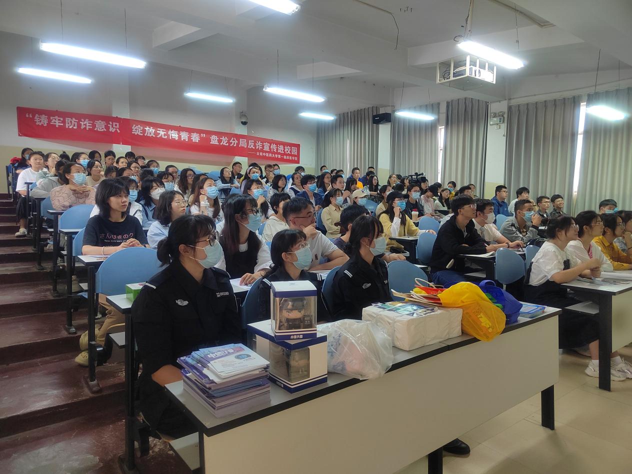 2022年10月6日下午进行,盘龙分局反诈中心民警为白塔校区全体本科生、研究生进行了共4场讲座,覆盖白塔校区八百多名师生,并全部发放了反诈宣传资料。反诈中心民警向师生们详细讲解了新型电信网络诈骗的形势、种类及危害,拓东社区民警结合辖区近期高发的真实案例,以通俗易懂、生动有趣的形式,剖析了大学生遭遇诈骗心理,详细讲解了各类高发电信诈骗案例特征、易受骗人群,教育引导师生提高识骗、防骗能力,共同筑牢反诈防护墙。讲座最后还进行了有奖问答,拓东社区民警贴心地为同学们准备了丰富的小奖品,同学们踊跃回答问题,现场气氛热烈,会后还对安装使用“国家反诈中心APP”遇到的问题进行答疑解惑。