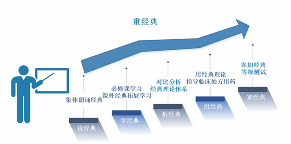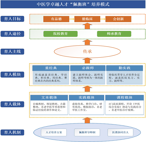 以有品德、能临床、会创新为育人目标,以院校教育和师承教育为育人途径,以传承为育人主线,以“重经典、必跟师、勤实践”为育人模块,以班级、文本、实践、课程为育人载体,建立医教协同育人机制。