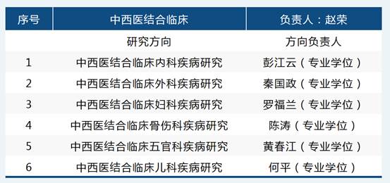 中西医结合临床学位点有专兼职导师183人,硕士研究生导师183人,中西医结合临床内科方向导师134人,中西医结合临床外科方向导师68人,中西医结合临床妇科方向导师23人,中西医结合临床儿科方向导师14人,中西医结合临床骨伤科方向导师27人,中西医结合临床五官科方向导师16人。