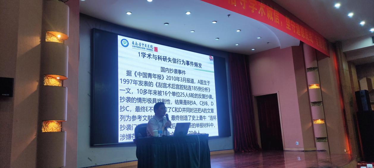 云中讯 (通讯员 王乾龙)为强化学术诚信意识,规范研究生学术行为,落实立德树人根本任务。2021年4月25日下午14:00,第一临床医学院组织开展以“恪守学术诚信,坚守道德底线”为主题的学术诚信教育讲座,由云南中医药大学学术委员会主任秦国政教授主讲,2020级研究生300余人参加。