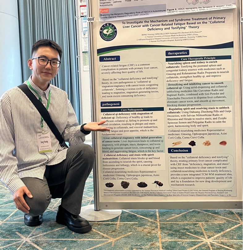 我校第一临床医学院研究生董银星同学作为学校培养的高层次中医药人才代表,以壁报展示形式,向大会汇报了《基于“络虚通补”理论探讨原发性肝癌合并癌因性疲乏的临证思路》,基于中医络病理论,创新性地提出“络气虚滞/郁滞,癌毒壅络”的核心病机,确立了以“络虚通补”为核心的治疗法则,详细阐述了“培补脾肾、解毒制癌、化瘀通络、调养心神”的综合干预策略及其临床路径,并对虫类药与荣络药的应用价值进行了梳理,充分彰显了中医药在应对恶性肿瘤并发症方面的独特理论深度和显著临床优势。