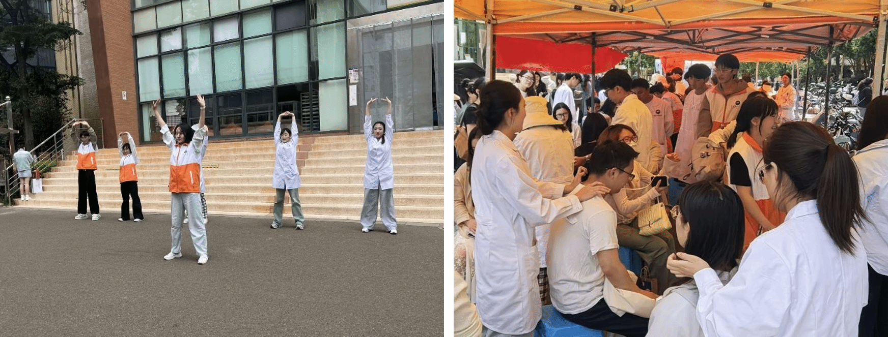 在室外现场,问诊区前面排起长队,博士生郗域江、张授尧耐心问诊,为来诊师生提供个性化调养建议,将中医辨证施治智慧转化为实用健康指导。在八段锦功法展示区,第一临床医学院青年服务志愿队员以流畅的动作展示八段锦招式,吸引众多师生驻足观看并参与学习。在中医特色疗法体验区,志愿者们运用专业手法进行艾灸、耳穴疗法,为师生测量血压,采用刚柔并济的点按、揉捻、弹拨等手法为来诊师生进行推拿,有效缓解青年群体因长期伏案工作导致的颈肩僵硬、腰肌劳损等问题。