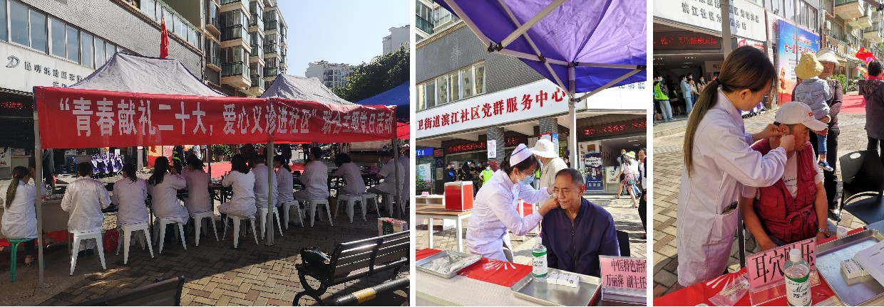 在滨江社区,第五党总支联合第四党总支为群众进行健康义诊,同时提供免费中医耳穴贴压特色治疗、合理用药咨询、医学影像阅片、健康宣教以及教授传统健身功法等服务。通过义诊活动,传播健康理念,弘扬中医药知识,践行党的初心,履行党员义务。