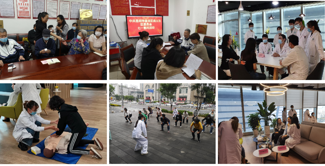在尚义社区,第五党总支党员代表慰问了社区党员同志,赠送了云南省中医医院院内制剂“紫连膏”,宣讲健康知识,并为社区居民提供了推拿按摩服务,切实帮助提升居民健康理念,紧密联系群众,让党的温暖深入人心。在恒隆广场的办公区,来自妇科、眼科、内科、推拿科、儿科的党员志愿者为 社区工作人员及群众提供义诊、推拿、耳穴贴压、健康咨询等服务,还带领在场群众练习八段锦功法,帮助他们建立健康的观念,对疾病做到早预防、早诊断、早治疗。此外,党员志愿者现场进行了心肺复苏等急救演示和辅导,提高辖区群众应急能力。用实际行动,践行社会主义核心价值观。