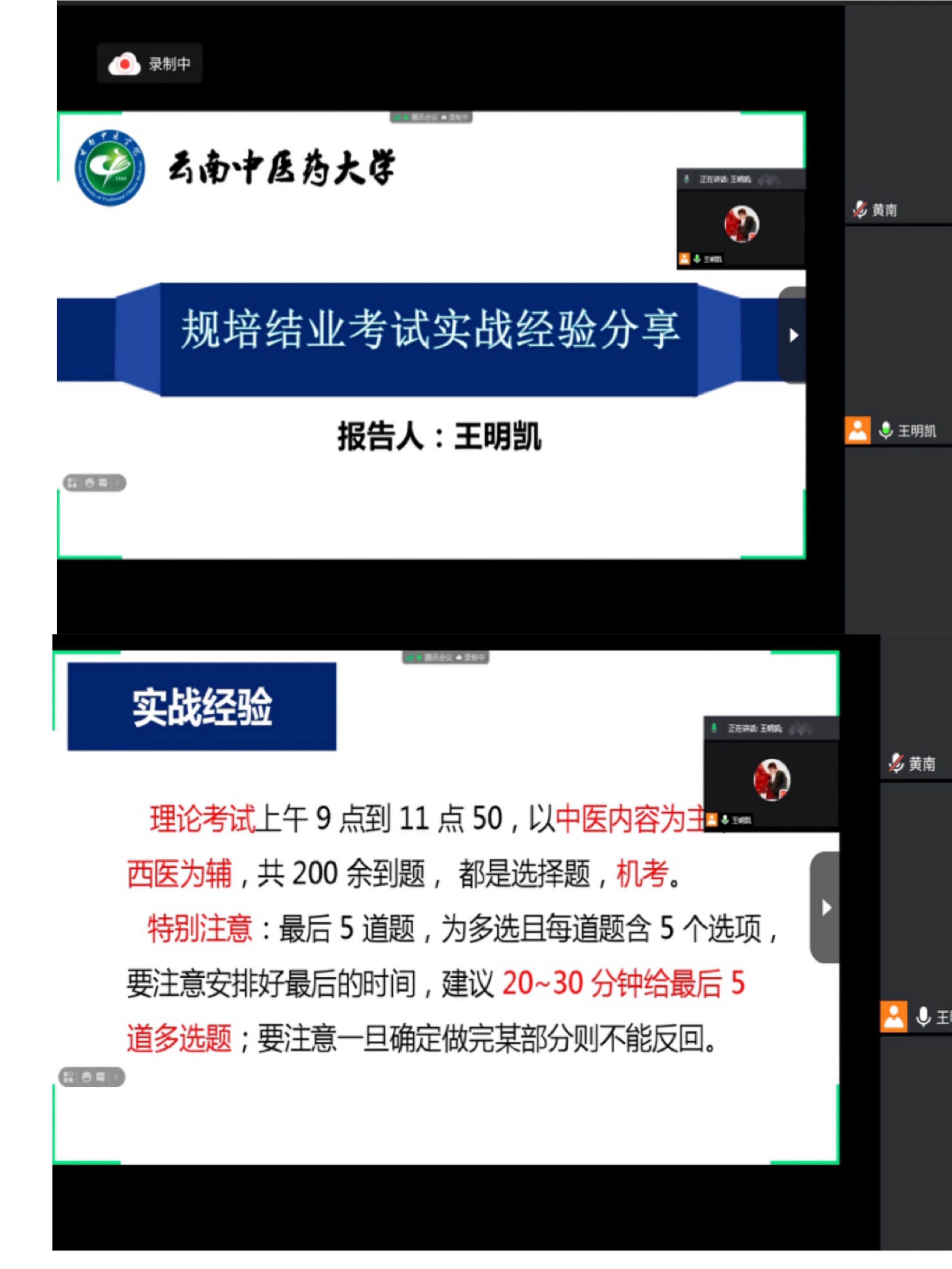 18级应届毕业生王明凯同学以“规培结业考试实战经验分享”为题,重点分享技能操作与体格检查考试心得与经验,他围绕规培考试组成,从实战经验,注意事项,与考试技巧三方面进行分享,强调规培考试重在平时临床实习的积累,在接诊患者、书写病历时就严格按照住院医师考核要求规范操作,平时工作中多学习带教老师和患者谈话的技巧,考试内容比重按照针灸配穴,五官科,骨伤科以及康复推拿依次递减,复习时应该分清主次,有的放矢。