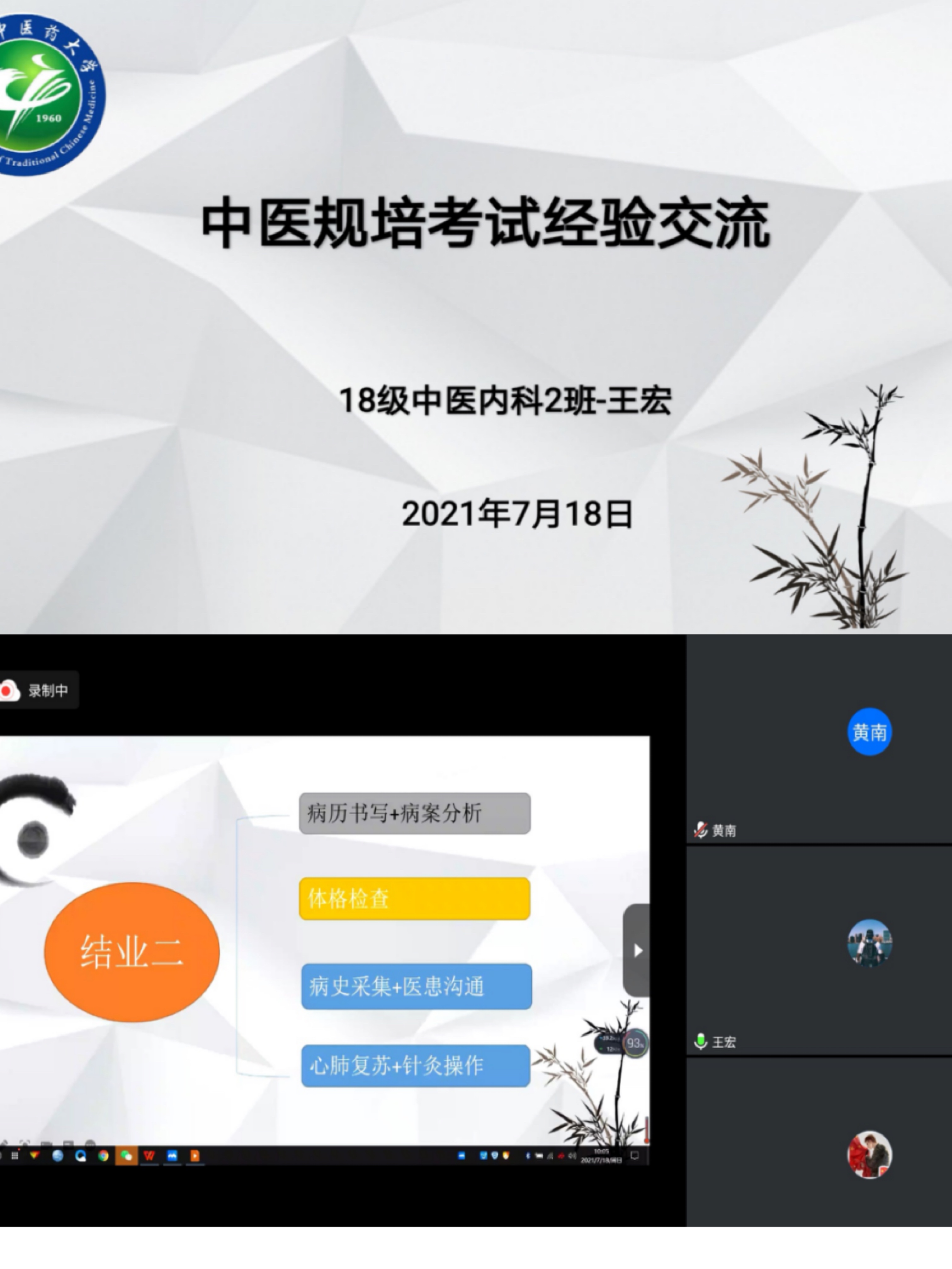 中医内科学18级毕业生王宏同学分享题目为“中医规培考试经验交流”,他从理论考试、辅助判图、病历书写、病例分析、实践操作等方面选取案例题目进行讲解,重点针对医患沟通、病例分析及问诊环节进行经验分享,并列举了辅助判读常见题型,针对考试易错题进行深入分析。他认为在临床实践中应重点培养临床思维决策能力,在考试过程中要“注重人文关怀”,体现当代医学研究生良好的职业素养和医德医风。