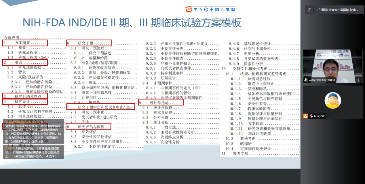 云中讯(通讯员 杨隽)为进一步提升我院研究生开展临床试验研究的规范性,推动药物与医疗器械临床试验规范研究和提升质量,10月27日晚19:30-21:30,研究生管理办公室举办了临床试验与《药物临床试验质量管理规范》(简称GCP)线上交流会,会议邀请第一临床医学院临床药物试验研究中心贺建昌主任主讲,我院2019、2020、2021级博士研究生和硕士研究生,共计200余人参会。