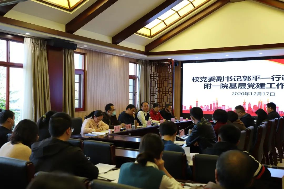 云中讯 2020年12月17日下午,校党委副书记郭平一行到第一附属医院调研指导基层党建工作,调研指导主要采取听取汇报、座谈交流等方式进行,2020年党支部规范化建设达标考核校级复查工作同时进行。党支部规范化建设达标考核校级复查组成员,医院党政领导、党总支书记、副书记;22个2020年规范化建设达标创建党支部书记;其他无临床、教学任务党支部书记共计80余人参加了会议,会议由医院党委书记陈燕溪同志主持。