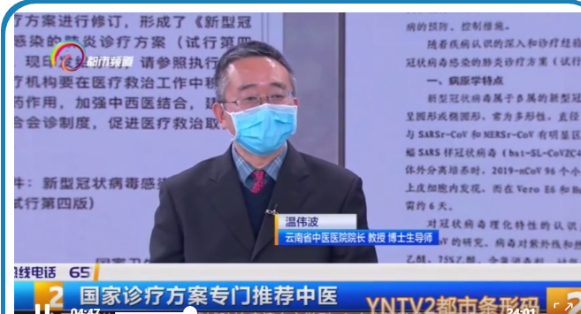 中医内科学导师温伟波,作为医院院长和学科带头人,自疫情发生以来,全面协调组织全体职工 抗御病毒,在百忙之中来到云南电视台《都市条形码》演播室,现场为广大市民解读中医如何抗击新型冠状病毒;他亲自牵头,集全院之力,迅速研发院内制剂,经云南省卫生健康委员会推荐、省药品监督管理局批准,成功申报的健体抗疫合剂、气阴双补养血合剂、清瘟解热合剂、贯防合剂4个中药制剂,获准在云南省新冠肺炎定点救治医院直接调剂使用;他还亲临云南省传染病医院,诊治新冠肺炎患者。