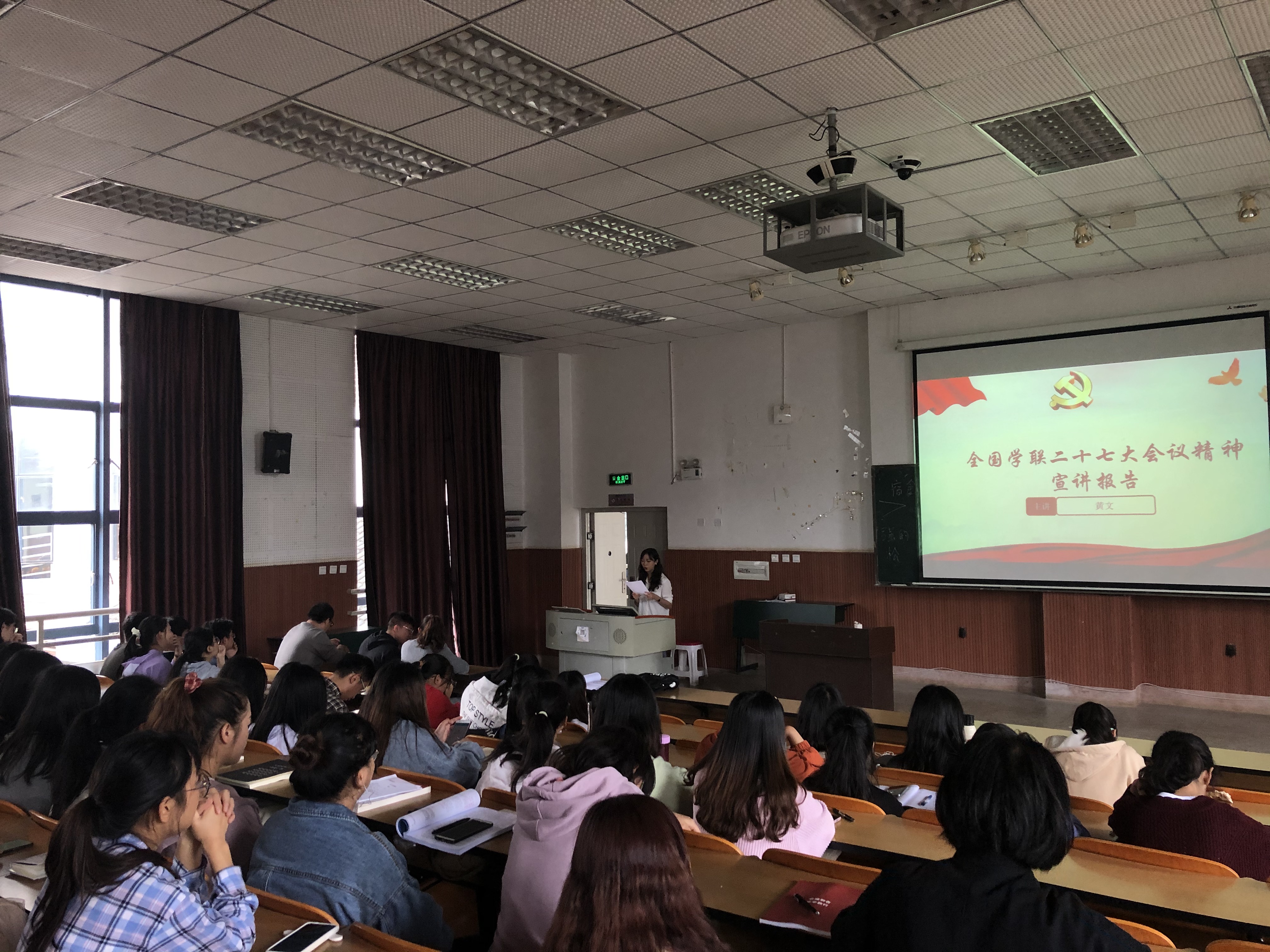 黄文同学从大会概况、大会议程、大会核心精神、大会重要意义、个人参会经历等方面做了精神传达和宣讲,重点传达了总书记的贺信精神以及全国学联工作报告的主要内容。并号召全体青年要牢记总书记的谆谆教导,听党话、跟党走,学生干部要服务好同学,以更高、更严的标准要求自己,与祖国共成长,与人民同奋进。