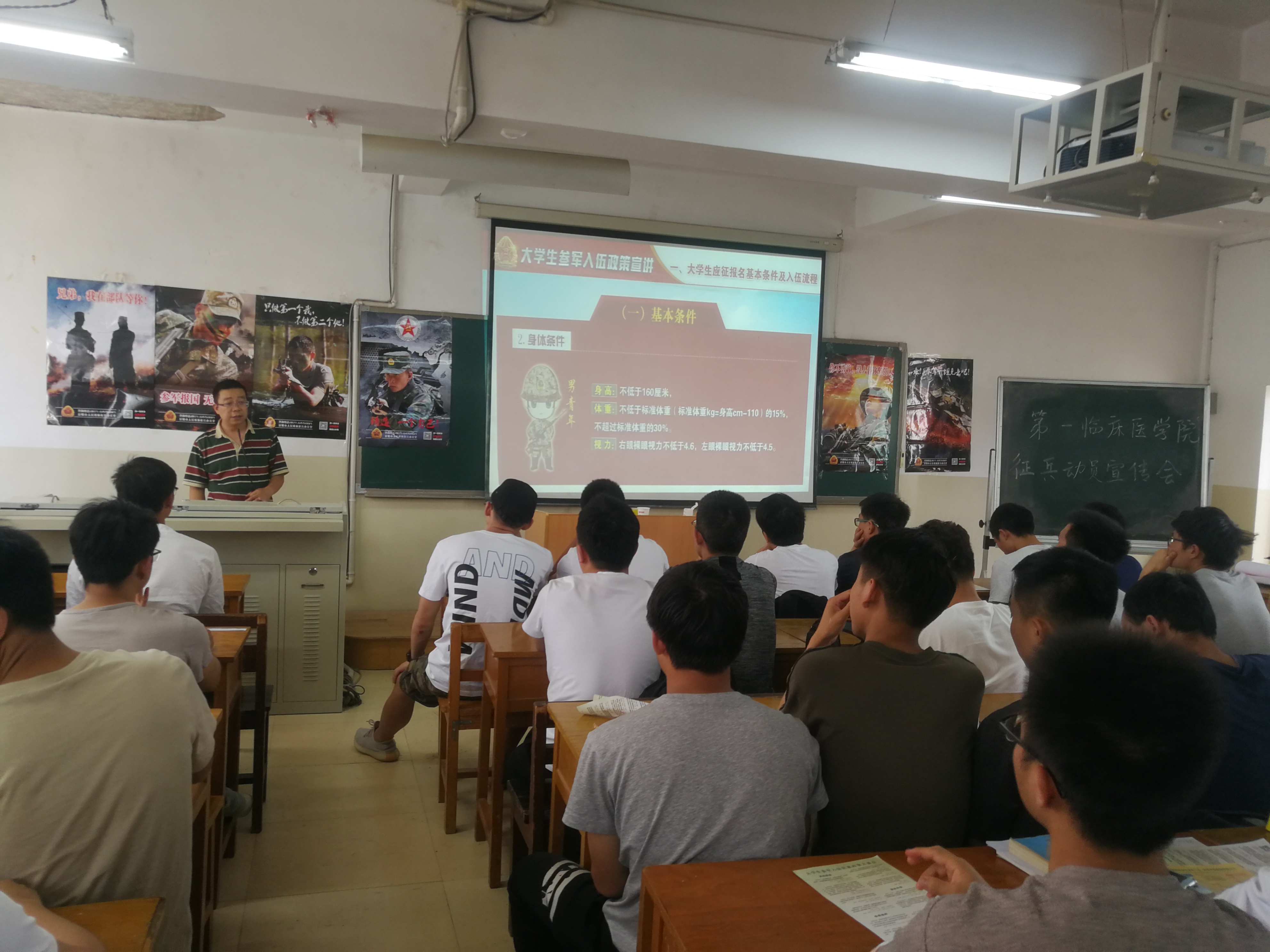 2019年5月10日下午,第一临床医学院召开大学生参军入伍宣传动员会,党委委员、副院长赵荣,学生管理办公室主任王萍,临床医学院党总支副书记冯富来,学生管理办公室相关工作人员及临床医学院适龄学生110人参加了会议,会议由王萍主任主持。