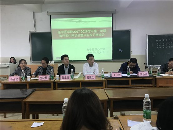 为进一步加强教学内涵建设,提高教学质量,临床医学院于2018年5月29日上午,在白塔校区第四多媒体教室组织召开了2017-2018学年第二学期师生教学座谈会暨毕业实习座谈会。会议由教学管理办公室杨若俊副主任主持,教务处实习管理科夏咸松副科长、保卫处郭永康及我院教学学生管理部门、教研室主任、教师代表、学生代表及各班级实习组组长共80余人参加座谈会。