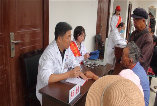 随后伴着淅淅沥沥的夏雨,村民们陆陆续续从家中赶来,义诊活动如火如荼、有条不紊如期进行。在第一附属医院临床医学院义诊专家李帆冰、赵永康、吴强、钱锐、陈霞的带领下,我们服务队的学生助理热心的为前来就诊的村民问诊把脉、量血压、赠送药品等。同时针对新华乡群众患有的常见病、多发病及当地气候特点,探索致病因素,进行病情指导,并耐心地解答他们提出的问题。有的同学还向现场村民发放了健康小知识宣传册,并以展板的形式、通俗易懂的语言,向村民宣传、普及健康小常识。