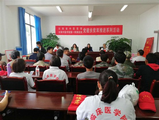 当天上午八点半,服务队全体成员,参加了第一附属医院临床医学院在卫生院会议室举行的党建扶贫双推进系列活动。学生第七党总支书记王云同志,带领全体与会党员重温入党誓词;驻村工作队代表和明伟同志作履职表态承诺;第一附属医院临床医学院陈燕溪书记发表讲话,并向医院党委、河南村党总支共建党支部授牌,同时向结对共建的三个党支部捐赠了党旗、党徽、党章、书籍等。