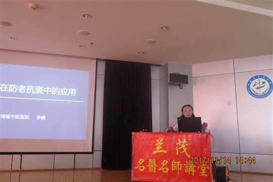 2017年11月14日下午,临床医学院“兰茂讲堂-名医名师讲堂”系列讲堂第九讲在附一院二号住院楼12楼报告厅举行。第一附属医院老年病科(干部保健科)副主任、一病区主任李晓教授做了《中医药在防老抗衰中的应用》的讲座。160余名研究生、实习生及医护人员聆听了此次讲座。